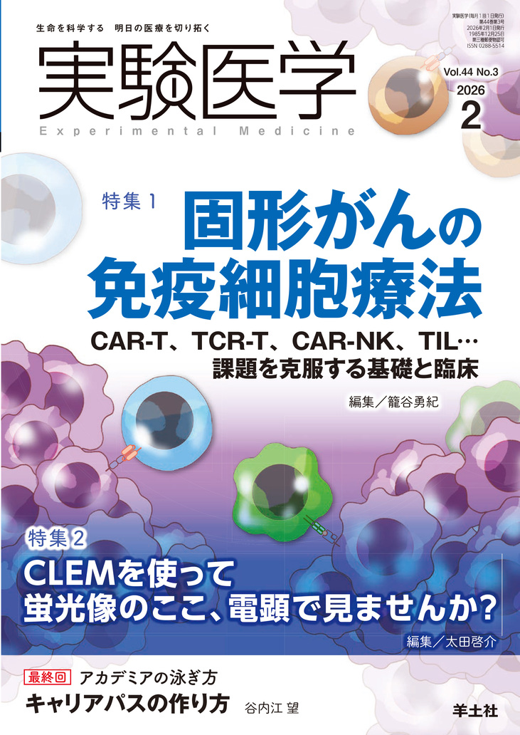 特集1:固形がんの壁を打ち破る! CAR-T細胞やTCR-T細胞,NK細胞,iPS技術など,多角的アプローチで弱点を克服し治療の限界を押し広げる「免疫細胞療法」の最前線に迫る/特集2:蛍光顕微鏡で捉えた現象を,電子顕微鏡の解像度でもう一度見る.研究の説得力を高める「光-電子相関顕微鏡法」への誘い