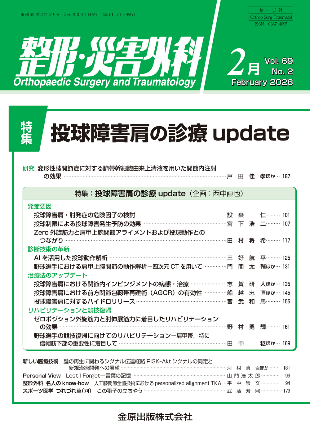 本特集では,いまだ多くの選手の長期離脱や競技継続の断念,手術を余儀なくされる原因となっている投球障害肩について,「発症要因」「診断技術の革新」「治療法のアップデート」「リハビリテーションと競技復帰」の4つの観点から,最新知見に基づいた現場ですぐに役立つ知識を,各分野の第一人者が体系的にまとめた。
